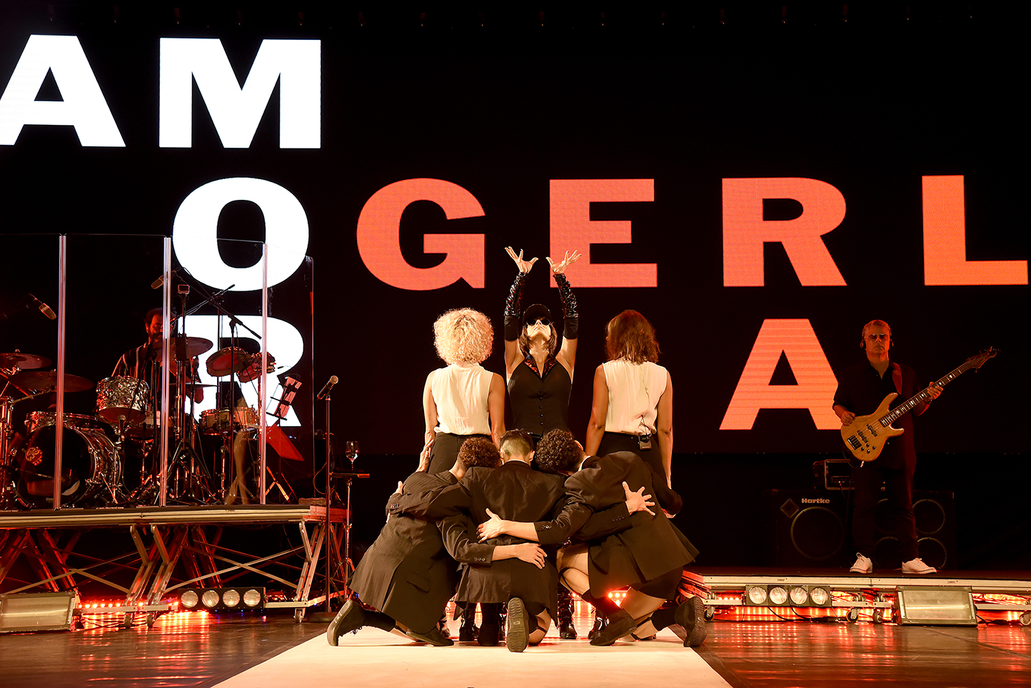 Na banda, incluindo a backing vocal e a bailarina, forte inspiração e apropriação de códigos da alfaiataria masculina para criar os looks. Cartela de cor minimalista com preto + branco e pitadas de vermelho a contemporaneidade dá o tom com um certo perfume de androginia.